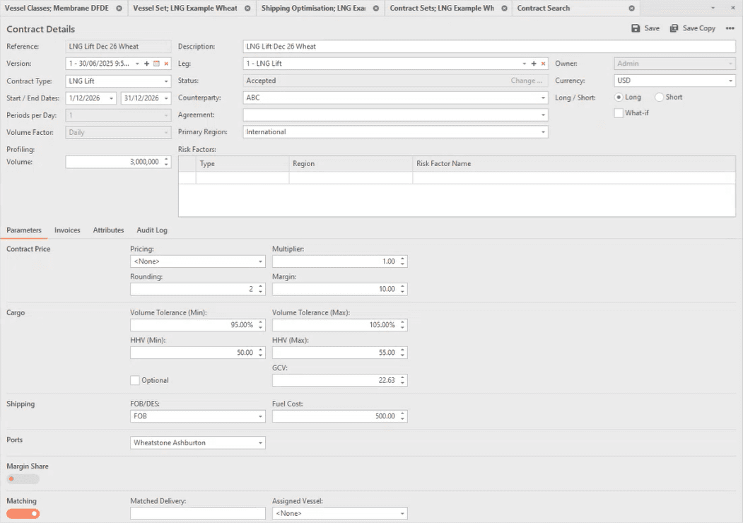 Define vessel capacities, heel and boil-off parameters, speeds, fuel consumption, charter costs, plus canal and port access restrictions. - Intrinsic Price-Driven Optimisation