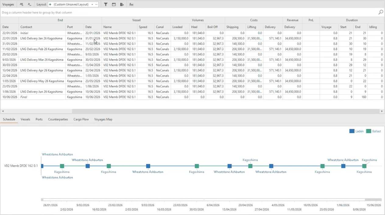 Because LNG Shipping Optimiser is part of Lacima Analytics, the resulting lifts and deliveries can be incorporated into broader portfolio reporting and risk workflows, supporting consolidated analysis of P&L, Earnings-at-Risk, Value-at-Risk and Potential Future Exposure.